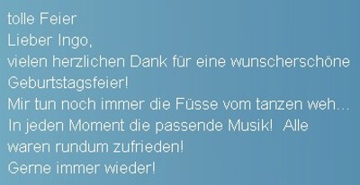 Außer sehr vielen, zufriedenen Brautpaaren und Geburtstagskinder, Silvestergäste, Ü30 Tänzer und jecke Karnevallisten, habe ich natürlich auch Firmenkunden gehabt, wie zum Beispiel das Eduardus Krankenhaus, den Berufsverband der deutschen Markforschung, die Stadt Köln, Anwaltskanzleien, Gesellschaft für Anlagen- und Reaktorsicherheit, Halloween auf der Burg Satzvey, Karneval im 12 Apostel und.....